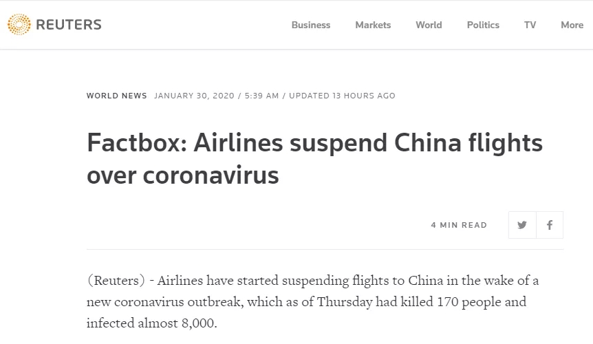 美國當(dāng)?shù)貢r(shí)間1月31日,據(jù)KTLA新聞報(bào)道,3家美國航司已經(jīng)宣布:暫停所有中美航班!