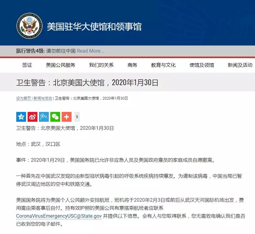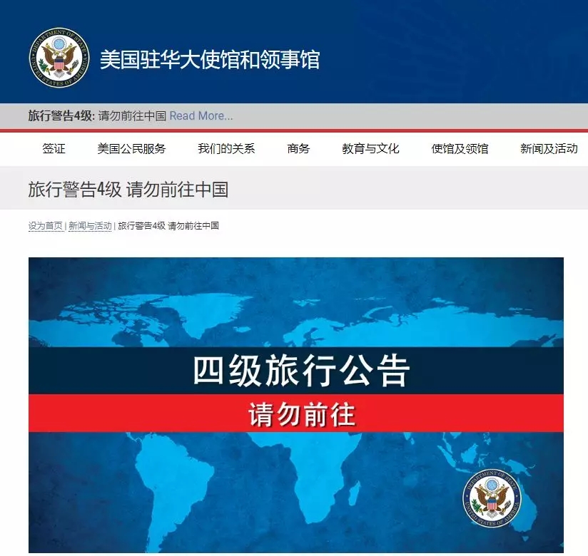 而美國駐華大使館在1月31日發(fā)布對(duì)中國的旅行4級(jí)警告,要求在美居民請(qǐng)勿前往中國。