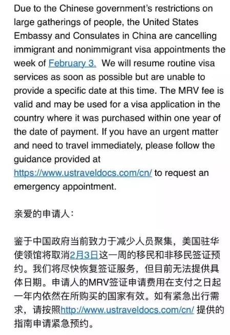 此前大使館發(fā)布消息,稱由于中國延長春節(jié)假期到2月2日,美國駐華大使館和所有總領(lǐng)事館將于2020年1月30日和31日(周四和周五)閉館,緊急美國公民服務(wù)將開放。