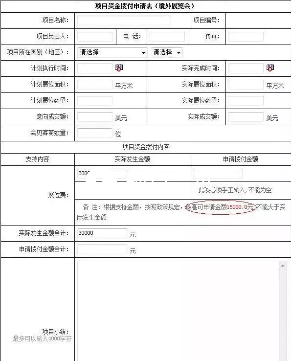 ③【實(shí)際發(fā)生金額】請(qǐng)?zhí)顚?xiě)實(shí)際的展位費(fèi)金額,【申請(qǐng)撥付金額】可根據(jù)下面提示的最高可申請(qǐng)金額填寫(xiě);