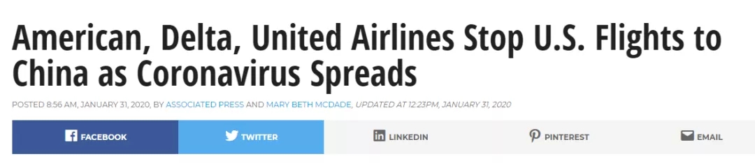 美國當(dāng)?shù)貢r(shí)間1月31日,據(jù)KTLA新聞報(bào)道,3家美國航司已經(jīng)宣布:暫停所有中美航班!