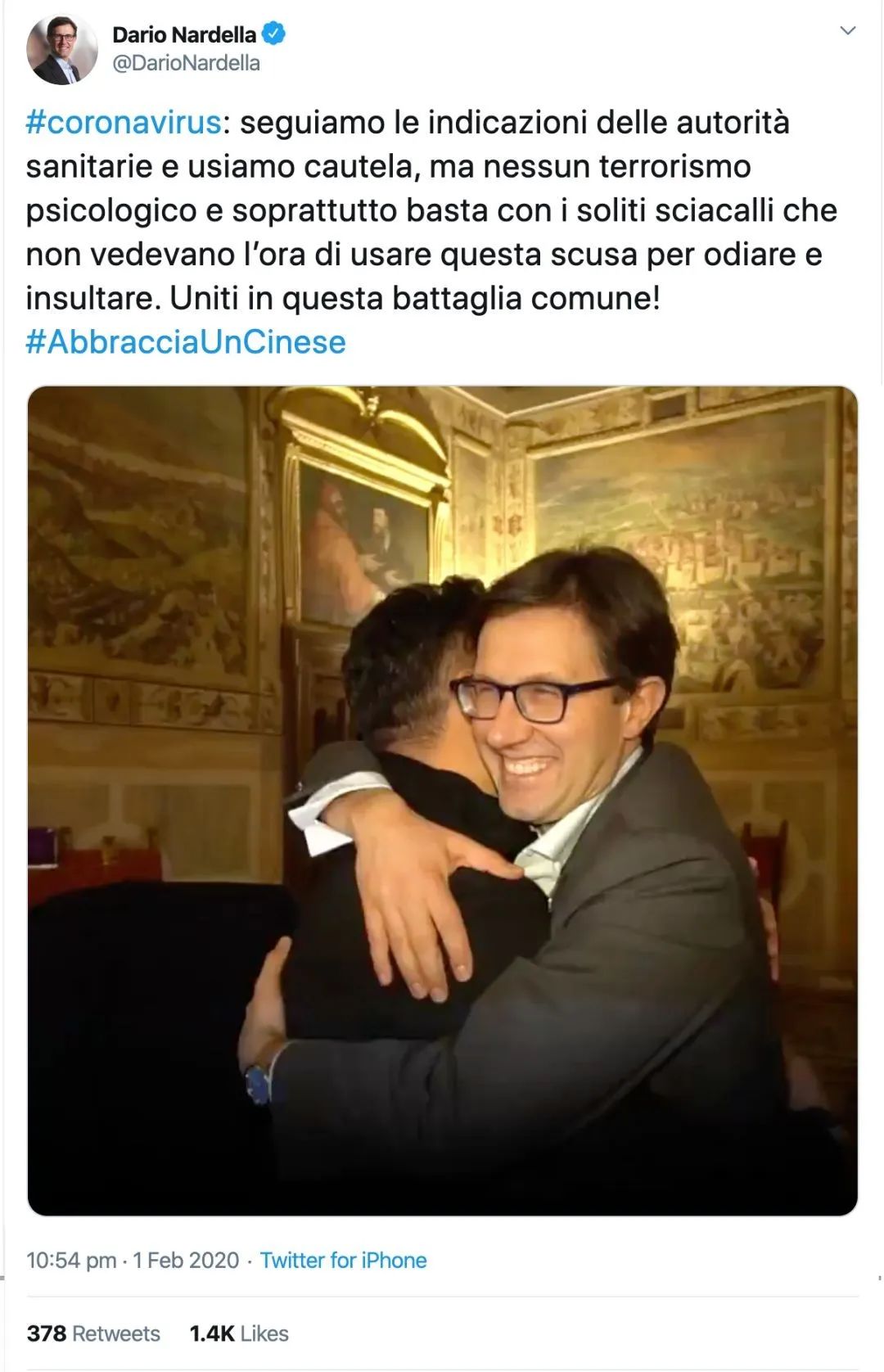 在意大利受到疫情影響而人心惶惶的時候,佛羅倫薩市市長達里奧·納德拉在推特上發(fā)起了一個“#擁抱一名華人(#AbbracciaUnCinese)”的話題標簽,并配推文說:“我們遵循衛(wèi)生當局的指導,我們謹慎行事,但絕不搞心理恐怖主義。”