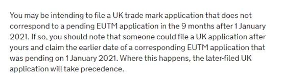 2021年1月1日起的9個月內(nèi),申請人若意圖提交與歐盟申請不一致的英國申請,那么需注意:也許某一人的歐盟商標(biāo)申請日晚于你的歐盟商標(biāo)申請日,但該申請人申請轉(zhuǎn)換與其歐盟商標(biāo)完全一致的英國商標(biāo),那么轉(zhuǎn)換后的英國商標(biāo)申請日將與其歐盟商標(biāo)申請一致,他的英國商標(biāo)申請日也將早于你的英國商標(biāo)申請日。