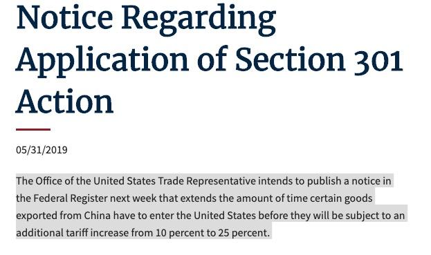 根據該公告,2019年5月10日前從中國出口到美國的產品在進入美國后,仍然會被額外征收10%的關稅,這些商品原定會在2019年6月1日被加征25%的關稅,但是USTR將這最終時間延長至6月15日。