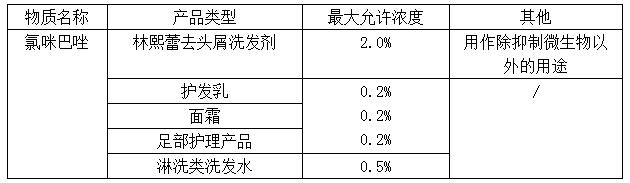 氯咪巴唑目前作為防腐劑在化妝品中使用,最大允許濃度為0.5%,而作為非防腐劑成分添加時,其濃度也須符合上述條款限值。歐盟消費者安全科學(xué)委員會(SCCS)對其進行評估,認為當氯咪巴唑作為防腐劑在面霜、護發(fā)乳、護足類化妝品中使用,最大濃度應(yīng)為0.2%;當氯咪巴唑作為去頭屑成分在淋洗類洗發(fā)劑中使用,最大濃度應(yīng)為2.0%。基于SCCS的意見,歐盟認為現(xiàn)行的氯咪巴唑監(jiān)管條款限值(0.5%)會對人體健康構(gòu)成潛在風(fēng)險,需要做進一步限制。具體修改內(nèi)容如下: