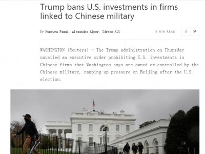 路透社消息,11月12日,特朗普政府公布了一項(xiàng)行政命令,禁止美國(guó)企業(yè)對(duì)部分中國(guó)公司的投資,限制對(duì)象「由中國(guó)軍方擁有或控制」的企業(yè)