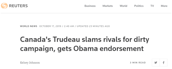 當?shù)貢r間16日,在加拿大議會大選的關(guān)鍵時刻,加拿大總理特魯多現(xiàn)身指責競爭對手進行骯臟競選活動,并獲得了美國前總統(tǒng)奧巴馬的聲援。