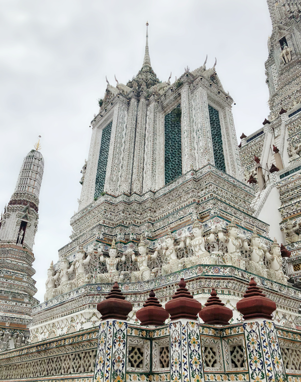 鄭王廟又叫黎明寺,規(guī)模僅次于大皇宮,其主殿和標(biāo)志性的五座佛塔是大家最常游覽的景點(diǎn)。廟內(nèi)最著名的大佛塔,始建于1842年,屬于大乘舍利塔式,尖塔的外面裝飾以復(fù)雜的雕刻,并鑲嵌了各種彩色陶瓷片、玻璃和貝殼等,是泰國(guó)規(guī)模最大的一座大乘塔。