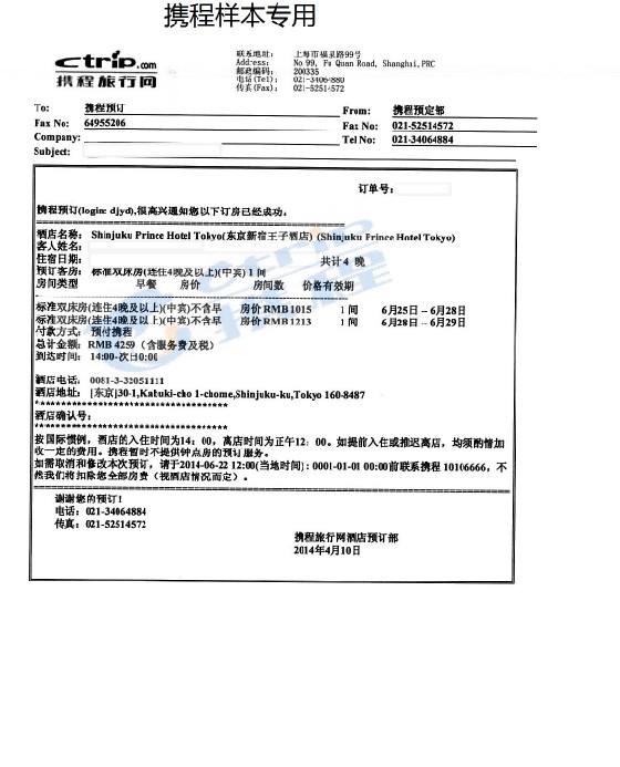 * 酒店訂單 原件 查看樣例