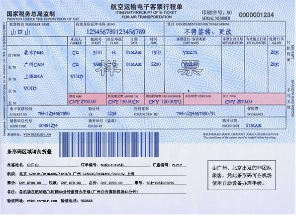 * 往返機票電子行程單 原件 查看樣例