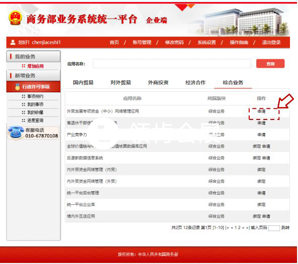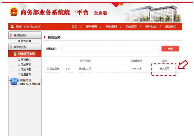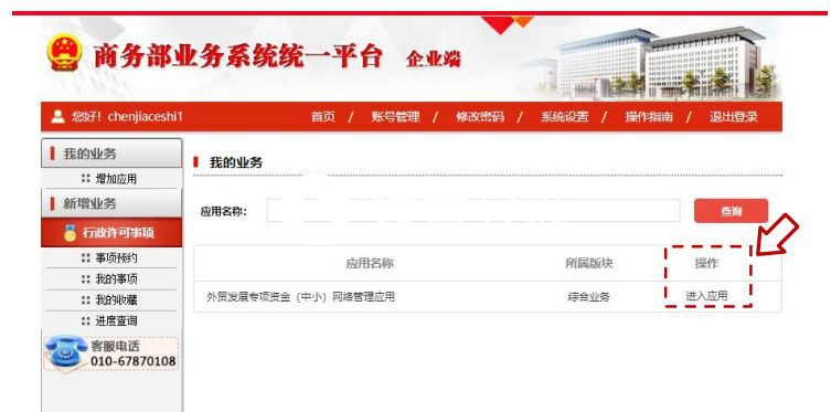 步驟4:中小企業(yè)用戶登錄成功后即可進(jìn)入個(gè)人業(yè)務(wù)大廳,選擇外貿(mào)發(fā)展專(zhuān)項(xiàng)資金(中?。┚W(wǎng)絡(luò)管理應(yīng)用后方的“進(jìn)入應(yīng)用”按鈕,進(jìn)入業(yè)務(wù)申報(bào)頁(yè)面。